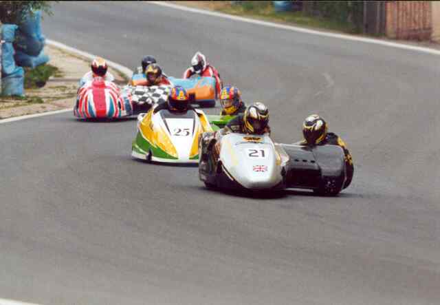 Seitenwagenma schinen schafften aber die Kurve ohne Unfall. Man beachte das Bein des Seitenwagenfahr ers der Nr. 17.