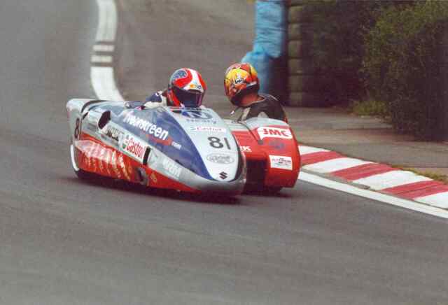 Der Beifahrer kauert sich auf der langgestreckte n Beiwagenmas chine auf dem Seitenwagen.