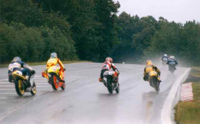 Kurz nach dem Start ging es bei der Anfahrt auf die Stadtkurve in Schleiz bei Regen dramatisch zu. Alle