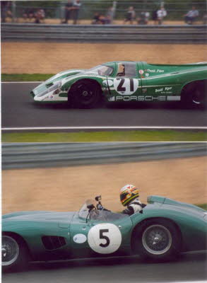Im Rahmenprogramm fuhren Rennfahrzeuge aus früheren Zeiten – oben ein Porsche 917 (1970), unten ein Aston Martin (1960).