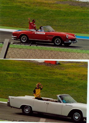 Bild 11 – FahrervorstellungDie Formel 1-Rennfahrer wurden auf Rennfahrzeuge ihrer Marke vorgestellt. Oben Rubens Barrichello auf einem „uralten“ Ferrari, das andere Bild Nick Heidfeld auf einem Ford.
