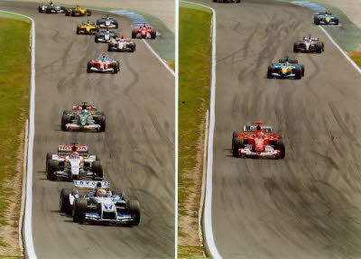 von Fernando Alonso, Kimi Raikkönen und Jarno Trulli. Mit Abstand dahinter folgte das Verfolgerfeld, angeführt vom BMW-Williams Fahrer Antonio Pizzonia. Ganz hinten ist der rote Ferrari von Rubens